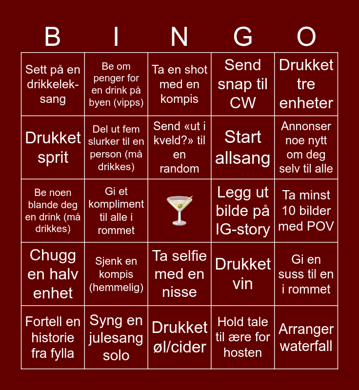 This bingo card has a free space and 24 words: Fortell en historie fra fylla, Sjenk en kompis (hemmelig), Send «ut i kveld?» til en random, Hold tale til ære for hosten, Drukket tre enheter, Sett på en drikkelek-sang, Be om penger for en drink på byen (vipps), Ta en shot med en kompis, Legg ut bilde på IG-story, Ta minst 10 bilder med POV, Be noen blande deg en drink (må drikkes), Del ut fem slurker til en person (må drikkes), Drukket vin, Gi en suss til en i rommet, Drukket sprit, Syng en julesang solo, Drukket øl/cider, Send snap til CW, Annonser noe nytt om deg selv til alle, Chugg en halv enhet, Gi et kompliment til alle i rommet, Ta selfie med en nisse, Start allsang and Arranger waterfall.