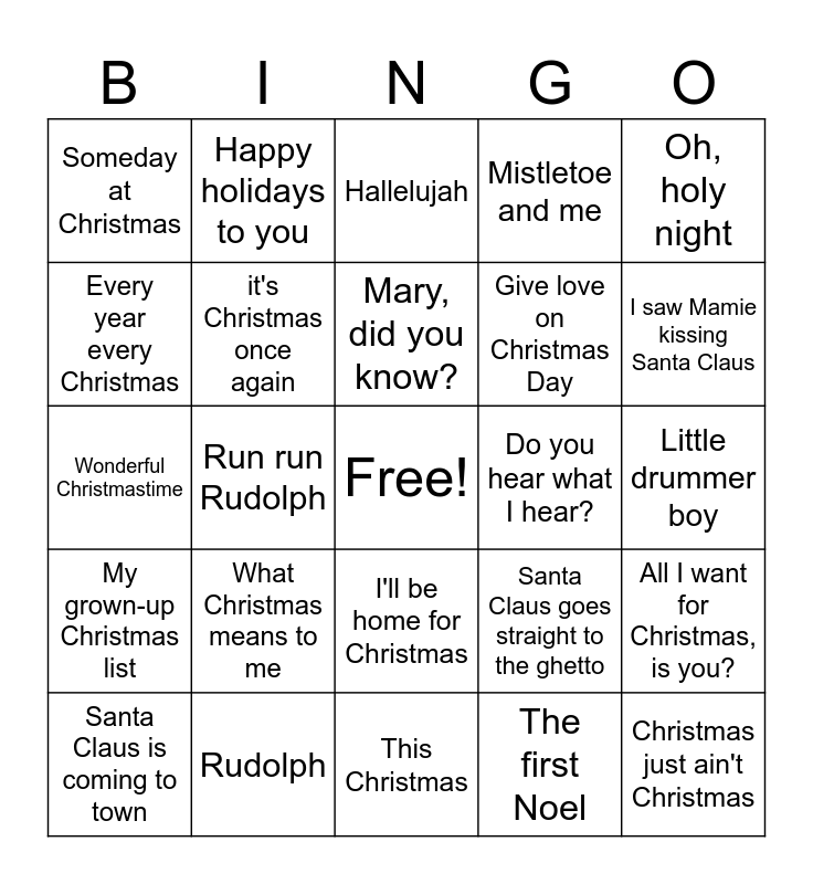 This bingo card has a free space and 49 words: Merry Christmas baby, Christmas just ain't Christmas, Oh Holy night, This Christmas, What Christmas means to me, Sleigh ride, Happy holidays to you, Joy to the world, Every year every Christmas, Christmas all over the world, it's Christmas once again, Mistletoe and me, All I want for Christmas, is you?, Santa Claus goes straight to the ghetto, Someday at Christmas, White Christmas, Mary, did you know?, Do you hear what I hear?, Winter Wonderland, Oh, holy night, Run run Rudolph, The first Noel, Someday at Christmas, Give love on Christmas Day, Feliz Navidad, I saw Mamie kissing Santa Claus, Santa Claus is coming to town, Santa baby, I'll be home for Christmas, My grown-up Christmas list, Have yourself a Merry Little Christmas, Silent night, Blue Christmas, So holiday, Rudolph, The Christmas song, Let it snow, Frosty the snowman, Little drummer boy, Jingle Bells, Joy to the world, Up on the Housetop, Look like Christmas, Snowman, Wonderful Christmastime, Hallelujah, Baby its cold outside, Jingle bell rock and Candy cane lane.