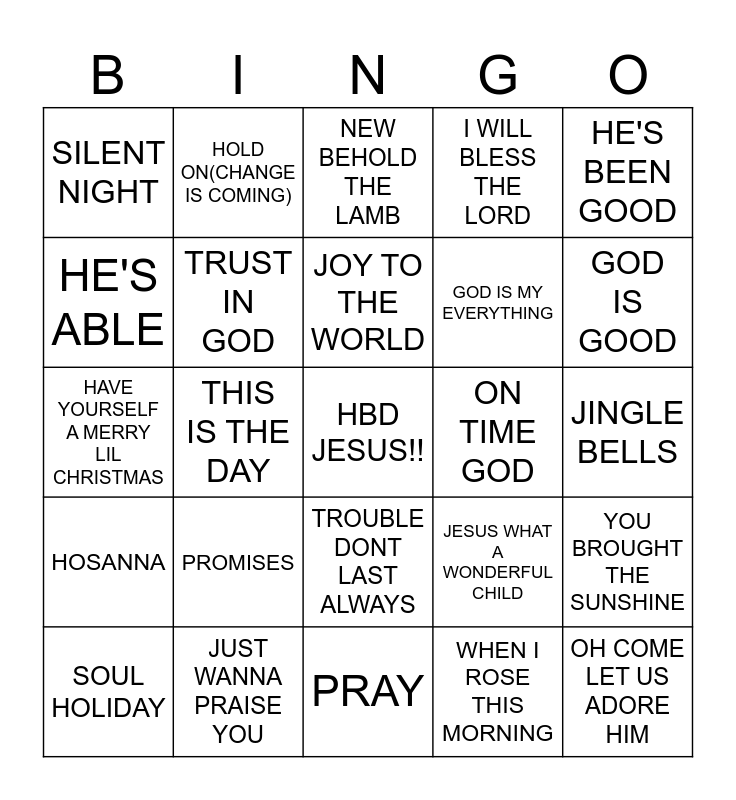 This bingo card has a free space and 24 words: SOUL HOLIDAY, PROMISES, JOY TO THE WORLD, WHEN I ROSE THIS MORNING, HE'S BEEN GOOD, SILENT NIGHT, HOLD ON(CHANGE IS COMING), NEW BEHOLD THE LAMB, ON TIME GOD, JINGLE BELLS, HAVE YOURSELF A MERRY LIL CHRISTMAS, TRUST IN GOD, JESUS WHAT A WONDERFUL CHILD, YOU BROUGHT THE SUNSHINE, HE'S ABLE, JUST WANNA PRAISE YOU, PRAY, I WILL BLESS THE LORD, GOD IS GOOD, HOSANNA, THIS IS THE DAY, TROUBLE DONT LAST ALWAYS, GOD IS MY EVERYTHING and OH COME LET US ADORE HIM.