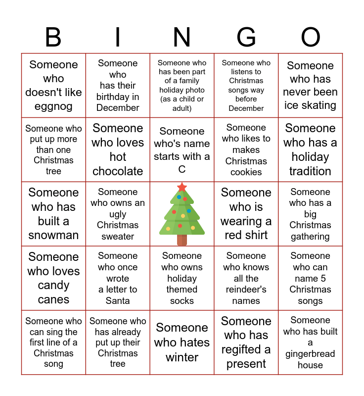 This bingo card has a free space and 24 words: Someone who once wrote a letter to Santa, Someone who has already put up their Christmas tree, Someone who's name starts with a C, Someone who can sing the first line of a Christmas song, Someone who has never been ice skating, Someone who doesn't like eggnog, Someone who put up more than one Christmas tree, Someone who has their birthday in December, Someone who is wearing a red shirt, Someone who owns holiday themed socks, Someone who likes to makes Christmas cookies, Someone who has built a snowman, Someone who knows all the reindeer's names, Someone who can name 5 Christmas songs, Someone who loves hot chocolate, Someone who has regifted a present, Someone who has a big Christmas gathering, Someone who has been part of a family holiday photo (as a child or adult), Someone who has a holiday tradition, Someone who owns an ugly Christmas sweater, Someone who has built a gingerbread house, Someone who loves candy canes, Someone who listens to Christmas songs way before December and Someone who hates winter.