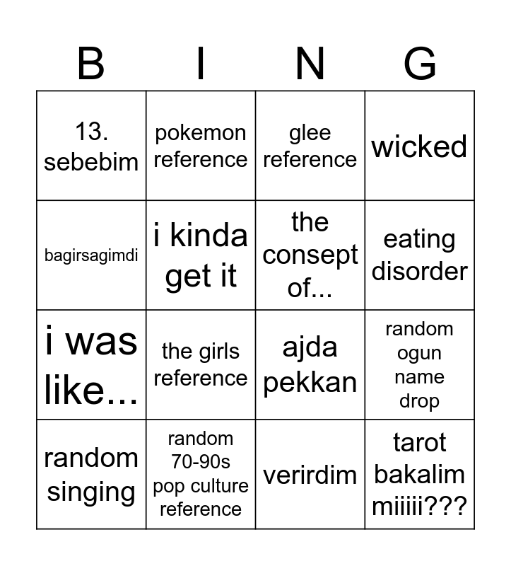 This bingo card has 16 words: random 70-90s pop culture reference, random ogun name drop, glee reference, 13. sebebim, i was like..., pokemon reference, ajda pekkan, verirdim, bagirsagimdi, i kinda get it, random singing, wicked, the girls reference, eating disorder, the consept of... and tarot bakalim miiiii???.