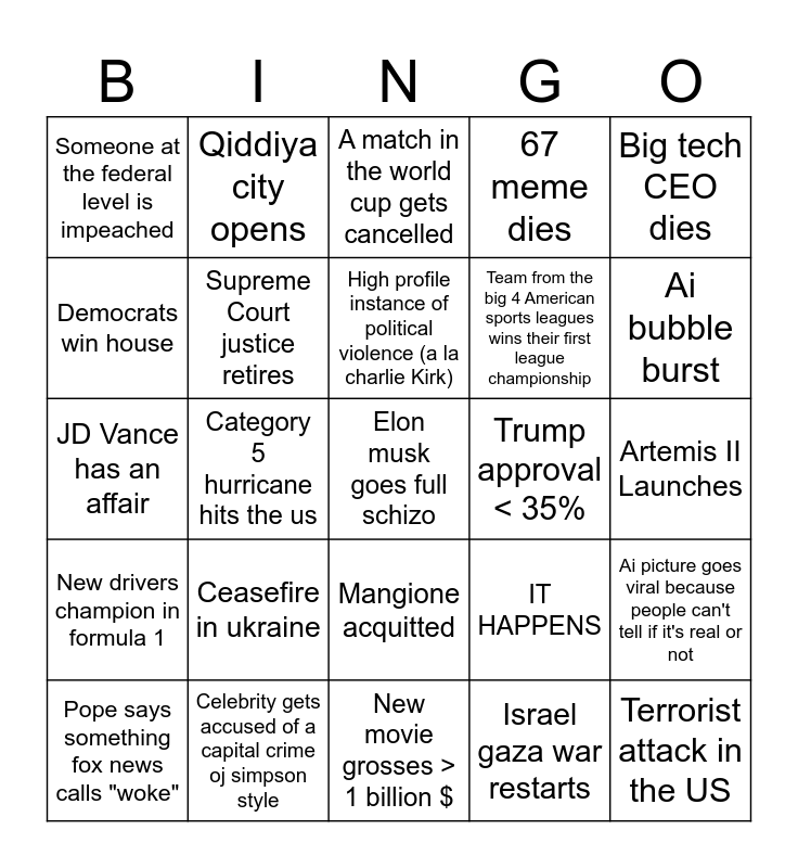 This bingo card has 25 words: Ceasefire in ukraine, New movie grosses > 1 billion $, High profile instance of political violence (a la charlie Kirk), Pope says something fox news calls "woke", Big tech CEO dies, Someone at the federal level is impeached, Democrats win house, Qiddiya city opens, Trump approval < 35%, Mangione acquitted, Team from the big 4 American sports leagues wins their first league championship, JD Vance has an affair, IT HAPPENS, Ai picture goes viral because people can't tell if it's real or not, Supreme Court justice retires, Terrorist attack in the US, Artemis II Launches, A match in the world cup gets cancelled, Ai bubble burst, Category 5 hurricane hits the us, Elon musk goes full schizo, Celebrity gets accused of a capital crime oj simpson style, New drivers champion in formula 1, 67 meme dies and Israel gaza war restarts.