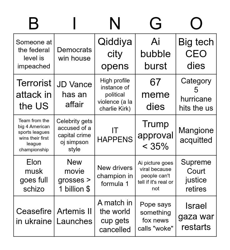 This bingo card has a free space and 24 words: Ceasefire in ukraine, New movie grosses > 1 billion $, High profile instance of political violence (a la charlie Kirk), Pope says something fox news calls "woke", Big tech CEO dies, Someone at the federal level is impeached, Democrats win house, Qiddiya city opens, Trump approval < 35%, Mangione acquitted, Team from the big 4 American sports leagues wins their first league championship, JD Vance has an affair, Ai picture goes viral because people can't tell if it's real or not, Supreme Court justice retires, Terrorist attack in the US, Artemis II Launches, A match in the world cup gets cancelled, Ai bubble burst, Category 5 hurricane hits the us, Elon musk goes full schizo, Celebrity gets accused of a capital crime oj simpson style, New drivers champion in formula 1, 67 meme dies and Israel gaza war restarts.