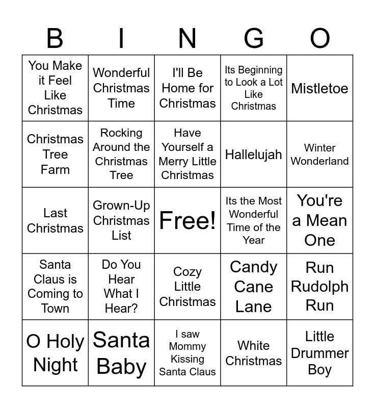 This bingo card has a free space and 35 words: All I Want for Christmas is You, Underneath the Tree, Jingle Bell Rock, Rocking Around the Christmas Tree, Cozy Little Christmas, Its Beginning to Look a Lot Like Christmas, Christmas Tree Farm, A Holly Jolly Christmas, Have Yourself a Merry Little Christmas, Merry Christmas, Happy Holidays, Last Christmas, Mistletoe, Sleigh ride, What Christmas Means to Me, You Make it Feel Like Christmas, Its the Most Wonderful Time of the Year, White Christmas, Grown-Up Christmas List, Santa Claus is Coming to Town, Little Drummer Boy, Candy Cane Lane, O Holy Night, Run Rudolph Run, Santa Baby, I'll Be Home for Christmas, Winter Wonderland, Deck the Halls, This Christmas, Hallelujah, You're a Mean One, Frosty the Snowman, I saw Mommy Kissing Santa Claus, Do You Hear What I Hear?, Wonderful Christmas Time and 12 Days of Christmas.