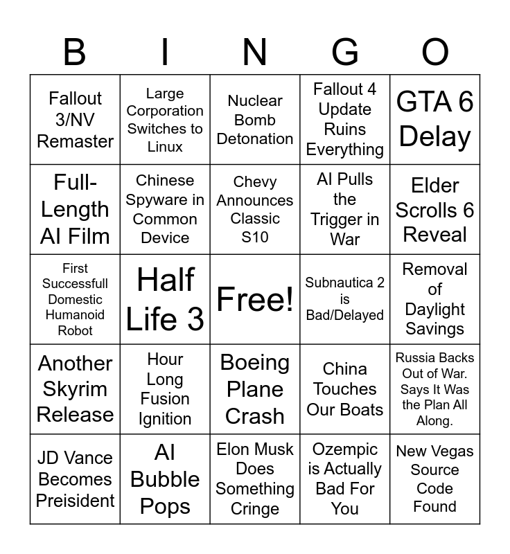This bingo card has a free space and 24 words: Hour Long Fusion Ignition, AI Bubble Pops, Chevy Announces Classic S10, JD Vance Becomes Preisident, GTA 6 Delay, Fallout 3/NV Remaster, Full-Length AI Film, Large Corporation Switches to Linux, Subnautica 2 is Bad/Delayed, Boeing Plane Crash, AI Pulls the Trigger in War, First Successfull Domestic Humanoid Robot, China Touches Our Boats, Russia Backs Out of War. Says It Was the Plan All Along., Chinese Spyware in Common Device, Ozempic is Actually Bad For You, Removal of Daylight Savings, Nuclear Bomb Detonation, Elder Scrolls 6 Reveal, Half Life 3, New Vegas Source Code Found, Another Skyrim Release, Fallout 4 Update Ruins Everything and Elon Musk Does Something Cringe.