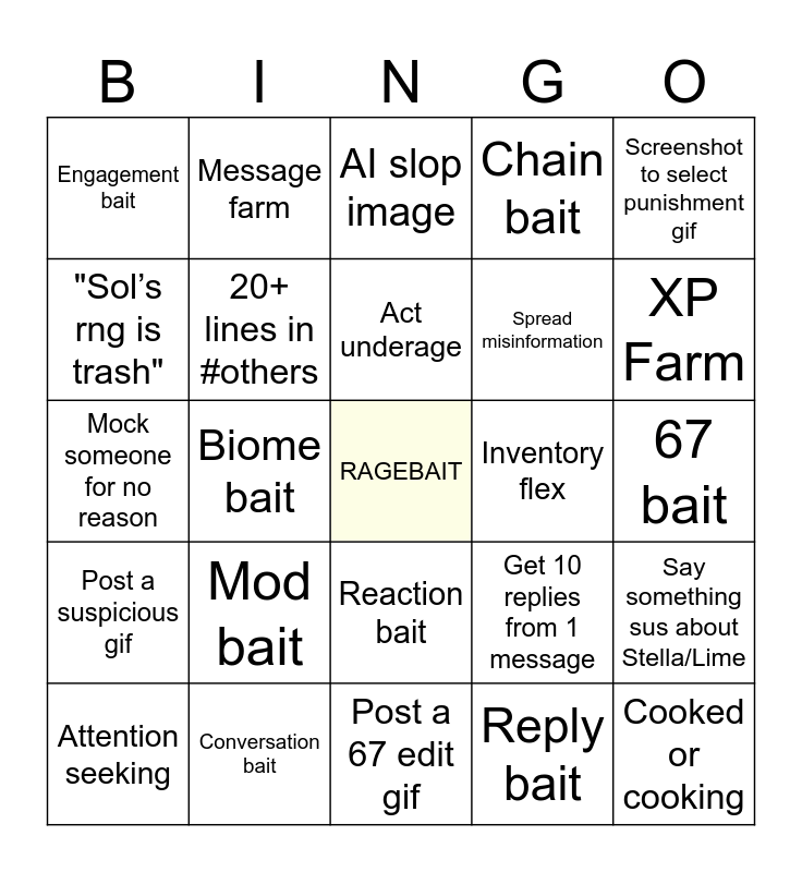This bingo card has a free space and 24 words: Mod bait, Conversation bait, Act underage, Attention seeking, Screenshot to select punishment gif, Engagement bait, "Sol’s rng is trash", Message farm, Inventory flex, Reaction bait, Spread misinformation, Mock someone for no reason, Get 10 replies from 1 message, Say something sus about Stella/Lime, 20+ lines in #others, Reply bait, 67 bait, AI slop image, XP Farm, Biome bait, Cooked or cooking, Post a suspicious gif, Chain bait and Post a 67 edit gif.