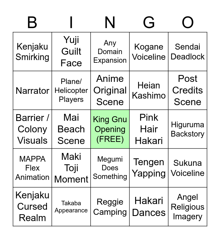 This bingo card has a free space and 24 words: Maki Toji Moment, Takaba Appearance, Anime Original Scene, Kenjaku Cursed Realm, Sendai Deadlock, Kenjaku Smirking, Narrator, Yuji Guilt Face, Pink Hair Hakari, Megumi Does Something, Heian Kashimo, Barrier / Colony Visuals, Tengen Yapping, Sukuna Voiceline, Plane/ Helicopter Players, Hakari Dances, Higuruma Backstory, Any Domain Expansion, Post Credits Scene, Mai Beach Scene, Angel Religious Imagery, MAPPA Flex Animation, Kogane Voiceline and Reggie Camping.