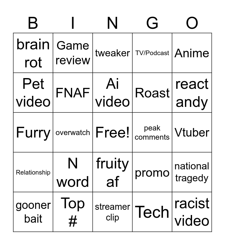 This bingo card has a free space and 24 words: N word, Top #, Ai video, gooner bait, Anime, brain rot, Pet video, Game review, peak comments, fruity af, Roast, Furry, promo, national tragedy, FNAF, Tech, Vtuber, tweaker, react andy, overwatch, racist video, Relationship, TV/Podcast and streamer clip.