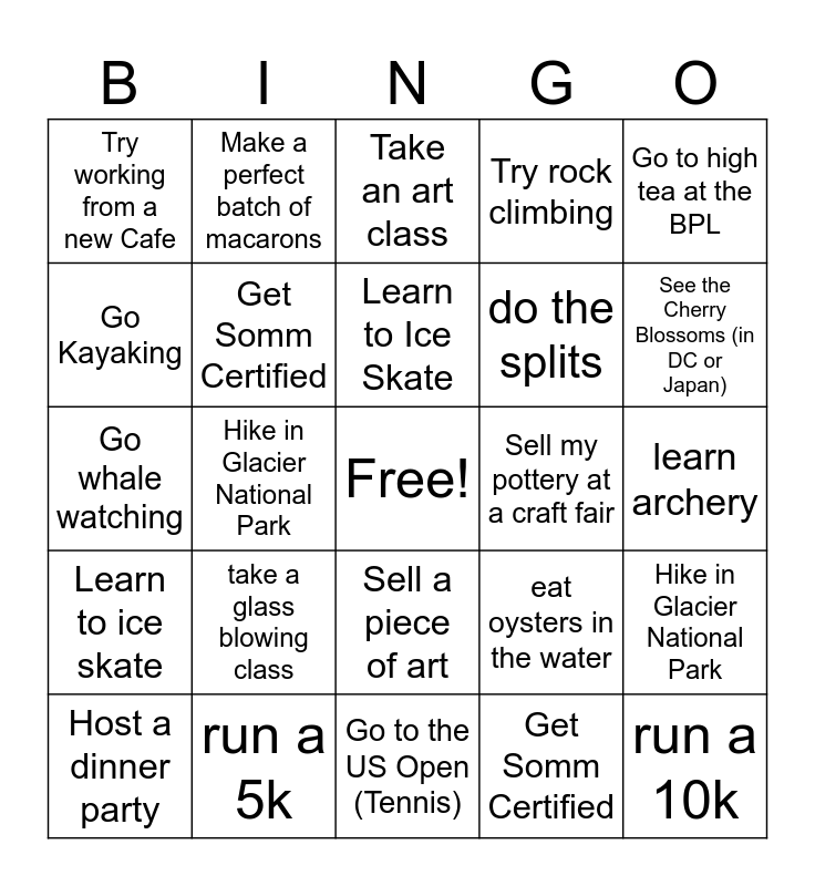 This bingo card has a free space and 32 words: Get Somm Certified, Go to Hight Tea at the BPL, Hike in Glacier National Park, Make a perfect batch of macarons, Learn to ice skate, Get Somm Certified, Go to high tea at the BPL, Hike in Glacier National Park, Make a perfect batch of macarons, Learn to Ski, Learn to Ice Skate, Take an art class, Play in a chess tournament, Learn to read tarot, Sell my pottery at a craft fair, Go to Montreal, Host a dinner party, Go whale watching, Sell a piece of art, take a glass blowing class, eat oysters in the water, Go white water rafting, learn archery, run a 5k, run a 10k, Try rock climbing, do the splits, Go Kayaking, Try working from a new Cafe, Go to the US Open (Tennis), See Niagara Falls and See the Cherry Blossoms (in DC or Japan).
