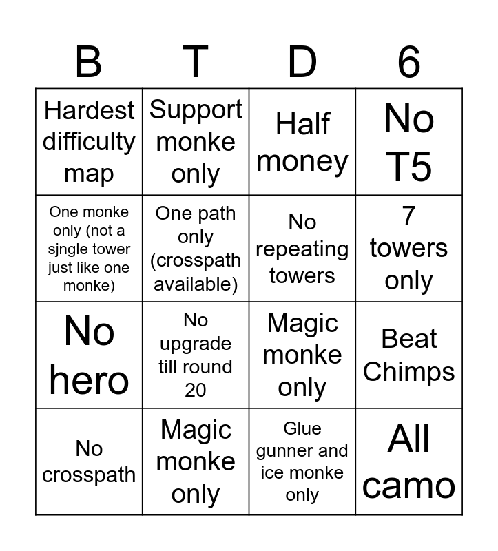 This bingo card has 16 words: Magic monke only, Beat Chimps, Half money, Hardest difficulty map, No hero, Support monke only, Magic monke only, Glue gunner and ice monke only, One monke only (not a sjngle tower just like one monke), One path only (crosspath available), No crosspath, No T5, No upgrade till round 20, 7 towers only, No repeating towers and All camo.