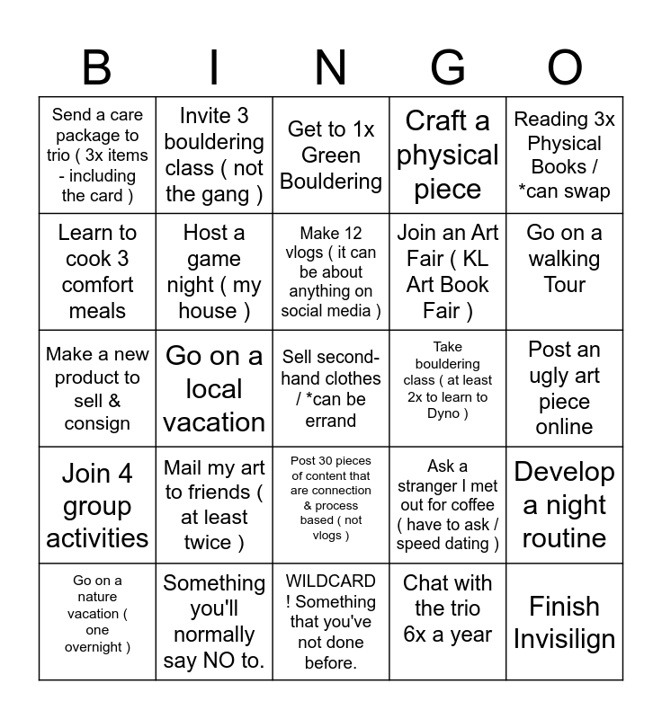 This bingo card has 25 words: Join 4 group activities, Something you'll normally say NO to., Sell second-hand clothes / *can be errand, Chat with the trio 6x a year, Reading 3x Physical Books / *can swap, Send a care package to trio ( 3x items - including the card ), Invite 3 bouldering class ( not the gang ), Get to 1x Green Bouldering, Take bouldering class ( at least 2x to learn to Dyno ), Develop a night routine, Learn to cook 3 comfort meals, Host a game night ( my house ), WILDCARD ! Something that you've not done before., Ask a stranger I met out for coffee ( have to ask / speed dating ), Go on a walking Tour, Go on a nature vacation ( one overnight ), Go on a local vacation, Make 12 vlogs ( it can be about anything on social media ), Join an Art Fair ( KL Art Book Fair ), Post an ugly art piece online, Make a new product to sell & consign, Mail my art to friends ( at least twice ), Post 30 pieces of content that are connection & process based ( not vlogs ), Craft a physical piece and Finish Invisilign.