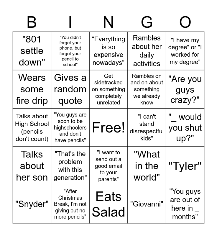 This bingo card has a free space and 24 words: "That's the problem with this generation", "After Christmas Break, I'm not giving out no more pencils", Get sidetracked on something completely unrelated, "Snyder", "I have my degree" or "I worked for my degree", "801 settle down", Wears some fire drip, "You didn't forget your phone, but forgot your pencil to school", "I can't stand disrespectful kids", "I want to send out a good email to your parents", Rambles on and on about something we already know, Talks about High School (pencils don't count), "What in the world", "Tyler", Gives a random quote, "Giovanni", "_ would you shut up?", "Everything is so expensive nowadays", "Are you guys crazy?", "You guys are soon to be highschoolers and don't have pencils", "You guys are out of here in _ months", Talks about her son, Rambles about her daily activities and Eats Salad.