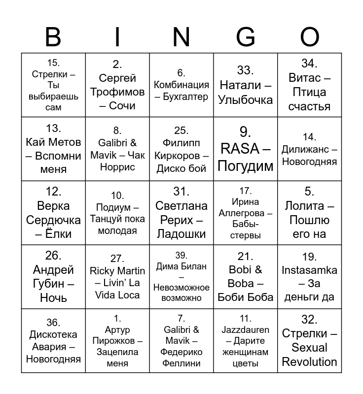 This bingo card has a free space and 24 words: 27. Ricky Martin – Livin’ La Vida Loca, 1. Артур Пирожков – Зацепила меня, 25. Филипп Киркоров – Диско бой, 36. Дискотека Авария – Новогодняя, 34. Витас – Птица счастья, 15. Стрелки – Ты выбираешь сам, 13. Кай Метов – Вспомни меня, 2. Сергей Трофимов – Сочи, 17. Ирина Аллегрова – Бабы-стервы, 39. Дима Билан – Невозможное возможно, 9. RASA – Погудим, 12. Верка Сердючка – Ёлки, 21. Bobi & Boba – Боби Боба, 19. Instasamka – За деньги да, 8. Galibri & Mavik – Чак Норрис, 11. Jazzdauren – Дарите женщинам цветы, 5. Лолита – Пошлю его на, 6. Комбинация – Бухгалтер, 14. Дилижанс – Новогодняя, 10. Подиум – Танцуй пока молодая, 32. Стрелки – Sexual Revolution, 26. Андрей Губин – Ночь, 33. Натали – Улыбочка and 7. Galibri & Mavik – Федерико Феллини.