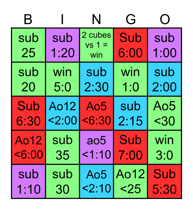 This bingo card has a free space and 24 words: sub 35, sub 30, sub 2:30, sub 1:10, sub 1:00, sub 25, sub 20, sub 1:20, sub 2:15, ao5 <1:10, win 1:0, Sub 6:30, Sub 7:00, win 3:0, win 5:0, Ao12 <25, Ao5 <30, 2 cubes vs 1 = win, sub 2:00, Ao12 <2:00, Sub 5:30, Ao12 <6:00, Sub 6:00 and Ao5 <2:10.