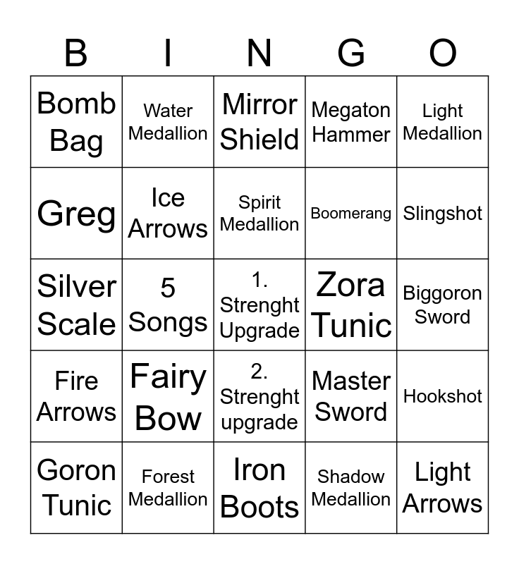 This bingo card has a free space and 24 words: Fairy Bow, Forest Medallion, Spirit Medallion, Goron Tunic, Light Medallion, Bomb Bag, Greg, Water Medallion, Zora Tunic, 2. Strenght upgrade, Boomerang, Silver Scale, Master Sword, Hookshot, Ice Arrows, Shadow Medallion, Biggoron Sword, Mirror Shield, Slingshot, 5 Songs, Light Arrows, Fire Arrows, Megaton Hammer and Iron Boots.
