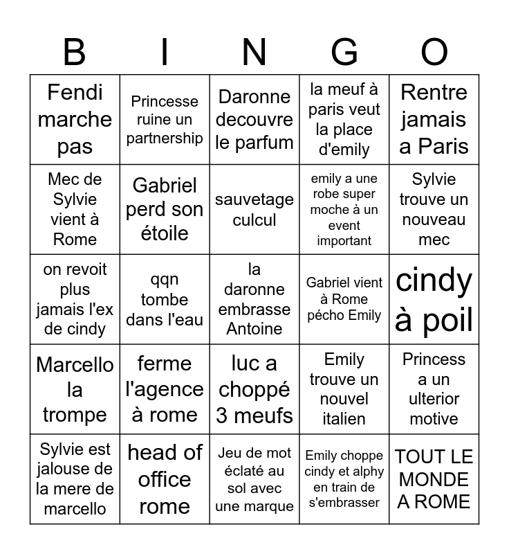 This bingo card has 25 words: Marcello la trompe, head of office rome, la daronne embrasse Antoine, Emily choppe cindy et alphy en train de s'embrasser, Rentre jamais a Paris, Fendi marche pas, Princesse ruine un partnership, Daronne decouvre le parfum, Gabriel vient à Rome pécho Emily, Princess a un ulterior motive, Mec de Sylvie vient à Rome, Gabriel perd son étoile, Jeu de mot éclaté au sol avec une marque, Emily trouve un nouvel italien, Sylvie trouve un nouveau mec, Sylvie est jalouse de la mere de marcello, qqn tombe dans l'eau, sauvetage culcul, emily a une robe super moche à un event important, cindy à poil, on revoit plus jamais l'ex de cindy, ferme l'agence à rome, luc a choppé 3 meufs, la meuf à paris veut la place d'emily and TOUT LE MONDE A ROME.