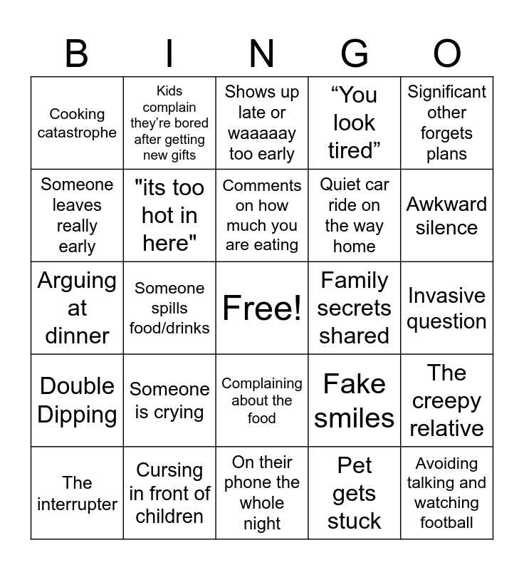 This bingo card has a free space and 34 words: Baby talk to Pets, Pet gets stuck, Tells the same story 3 times, Drunk Relative, Double Dipping, "its too hot in here", Significant other forgets plans, The interrupter, Kids complain they’re bored after getting new gifts, Racist Comment, Comments on how much you are eating, Shows up late or waaaaay too early, Unsolicited advice, Pet steals food, Family secrets shared, Awkward silence, Cursing in front of children, Arguing at dinner, Someone is crying, Fake smiles, Complaining about the food, No one helps with the dishes, Cooking catastrophe, Invasive question, On their phone the whole night, Avoiding talking and watching football, “You look tired”, You are asked to fix their phone or computer, Quiet car ride on the way home, Someone leaves really early, Dad Jokes, Someone spills food/drinks, The creepy relative and "if you would come around more often...".