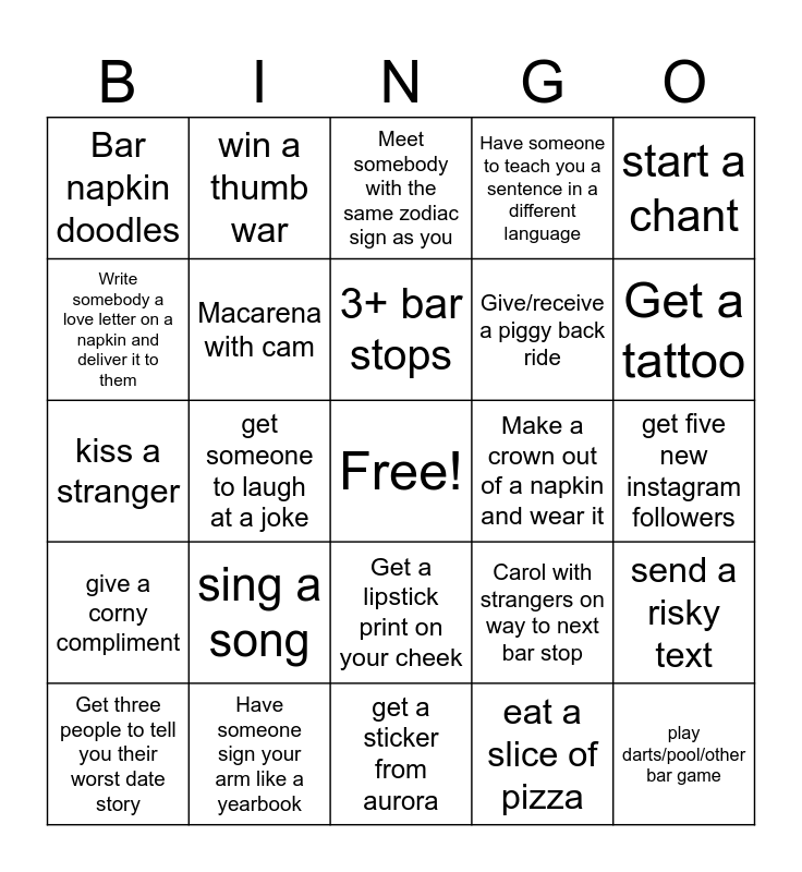 This bingo card has a free space and 42 words: Talk to somebody you’ve never met before, 3+ bar stops, Christmas carol, sing a song, eat a slice of pizza, send a risky text, play darts/pool/other bar game, Side quest for a snack and share with friends, Meet somebody with the same zodiac sign as you, Get a lipstick print on your cheek, get five new instagram followers, Get a tattoo, get someone to laugh at a joke, start a chant, play the jukebox, Carol with strangers on way to next bar stop, Get a stranger to join a crawl and come to the next bar, kiss a stranger, genuine compliment to five different people, win a thumb war, Write somebody a love letter on a napkin and deliver it to them, get your tarot read, talk to someone that you haven’t spoken to since last years pub crawl, Bar napkin doodles, Photobomb, Recite a poem, Give/receive a piggy back ride, Find someone with no instagram, Post an instagram story with two people you’ve never spoken to before, post a meme of your choice on insta, you see a rat in the street, give a corny compliment, Macarena with cam, get a sticker from aurora, Take a picture with someone who’s wearing the same color as you, Get three people to tell you their worst date story, Have someone sign your arm like a yearbook, Make a crown out of a napkin and wear it, Create a handshake with someone you’ve never met before, Get someone you haven’t met before to draw your portrait on the back of your bingo card, Have someone to teach you a sentence in a different language and Trade shirts with someone.
