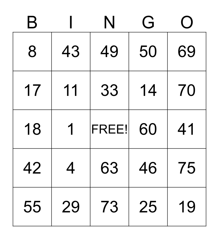 This bingo card has a free space and 24 words: 4, 29, 33, 55, 69, 8, 17, 43, 60, 63, 14, 18, 46, 75, 11, 25, 41, 49, 70, 1, 19, 42, 50 and 73.