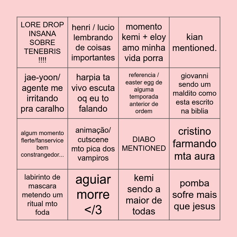 This bingo card has 16 words: aguiar morre </3, cristino farmando mta aura, momento kemi + eloy amo minha vida porra, LORE DROP INSANA SOBRE TENEBRIS !!!!, algum momento flerte/fanservice bem constrangedor..., henri / lucio lembrando de coisas importantes, DIABO MENTIONED, kemi sendo a maior de todas, jae-yoon/ agente me irritando pra caralho, harpia ta vivo escuta oq eu to falando, labirinto de mascara metendo um ritual mto foda, kian mentioned., animação/ cutscene mto pica dos vampiros, giovanni sendo um maldito como esta escrito na biblia, referencia / easter egg de alguma temporada anterior de ordem and pomba sofre mais que jesus.