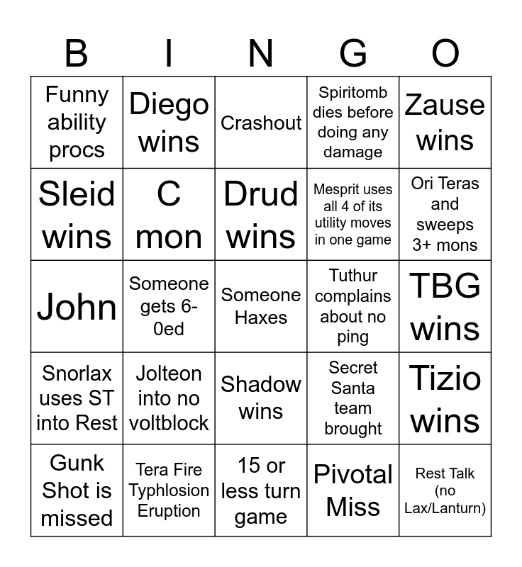 This bingo card has a free space and 64 words: OBB wins, Beavs wins, MJ wins, Tizio wins, BA wins, Saltman wins, Diego wins, Havoc wins, Drud wins, DD Joe wins, Shadow wins, Hxmo wins, TBG wins, Zause wins, Baddy wins, Sleid wins, Someone gets 6-0ed, Funny ability procs, Common pokemon uses uncommon moveset, Mesprit uses all 4 of its utility moves in one game, Jolteon into no voltblock, Snorlax uses ST into Rest, Spiritomb dies before doing any damage, Three layers of Spikes and SRs are set up, Venu ditto with neither player having acid spray, Basculin Psychic Fangs a Toxicroak, Zard misses Wisp, Hitmontop misses all three Axels, Lanturn procs Volt Absorb, Regirock takes sub 30% from a SE move, Rotom Mow tricks a scarf onto a Venu, Sandslash dies without doing anything, Sneasel H uses Sub, Weezing misses Wisp, Ori Teras and sweeps 3+ mons, Gunk Shot is missed, Pivotal crit, Pivotal Miss, UR mon, C mon, John, Tuthur complains about no ping, Whimsicott into zero fairy resist, Sand, Hail, Rest Talk (no Lax/Lanturn), Tera Fire Typhlosion Eruption, Stall, Secret Santa team brought, Trash Talk, Pokemon named after a player, Pokemon teras and is ohkoed, 15 or less turn game, Tricked item is knocked off, Poltergeist whiffs into an itemless mon, Protect + Leftovers, Crashout, Both players load MespLax, Hurricane is missed, Defog punish, 150+ turn game, Throw, Webs are placed and Toxic Spikes are placed.