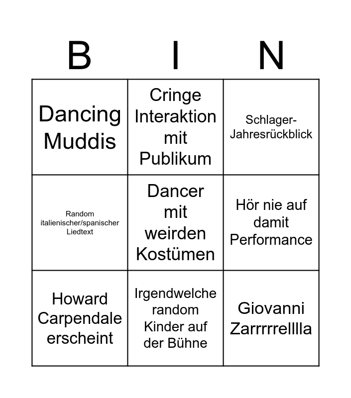 This bingo card has 9 words: Howard Carpendale erscheint, Schlager-Jahresrückblick, Cringe Interaktion mit Publikum, Random italienischer/spanischer Liedtext, Dancing Muddis, Hör nie auf damit Performance, Dancer mit weirden Kostümen, Giovanni Zarrrrrelllla and Irgendwelche random Kinder auf der Bühne.