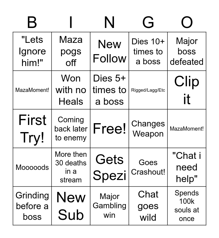 This bingo card has a free space and 24 words: More then 30 deaths in a stream, New Sub, Dies 5+ times to a boss, Grinding before a boss, Major boss defeated, "Lets Ignore him!", MazaMoment!, Maza pogs off, Changes Weapon, Gets Spezi, Rigged/Lagg/Etc, First Try!, Goes Crashout!, "Chat i need help", Won with no Heals, Chat goes wild, MazaMoment!, New Follow, Clip it, Coming back later to enemy, Spends 100k souls at once, Mooooods, Dies 10+ times to a boss and Major Gambling win.