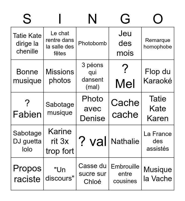 This bingo card has 25 words: Karine rit 3x trop fort, Casse du sucre sur Chloé, 3 péons qui dansent (mal), Propos raciste, Remarque homophobe, Tatie Kate dirige la chenille, Bonne musique, Le chat rentre dans la salle des fêtes, Cache cache, ? val, ? Mel, ?Fabien, Nathalie, La France des assistés, Missions photos, Musique la Vache, Tatie Kate Karen, Photobomb, Flop du Karaoké, Sabotage musique, Photo avec Denise, "Un discours", Sabotage DJ guetta lolo, Jeu des mois and Embrouille entre cousines.