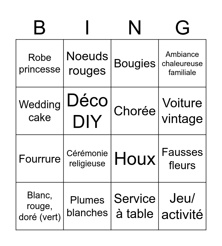This bingo card has 16 words: Plumes blanches, Fausses fleurs, Bougies, Robe princesse, Fourrure, Noeuds rouges, Houx, Service à table, Wedding cake, Déco DIY, Blanc, rouge, doré (vert), Ambiance chaleureuse familiale, Cérémonie religieuse, Voiture vintage, Chorée and Jeu/ activité.