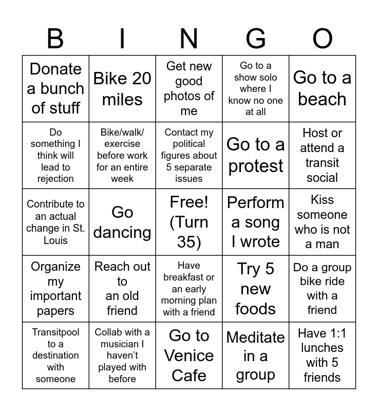 This bingo card has a free space and 24 words: Reach out to an old friend, Collab with a musician I haven’t played with before, Contact my political figures about 5 separate issues, Transitpool to a destination with someone, Go to a beach, Donate a bunch of stuff, Do something I think will lead to rejection, Bike 20 miles, Perform a song I wrote, Have breakfast or an early morning plan with a friend, Go to a protest, Contribute to an actual change in St. Louis, Try 5 new foods, Do a group bike ride with a friend, Bike/walk/ exercise before work for an entire week, Meditate in a group, Kiss someone who is not a man, Get new good photos of me, Host or attend a transit social, Go dancing, Have 1:1 lunches with 5 friends, Organize my important papers, Go to a show solo where I know no one at all and Go to Venice Cafe.