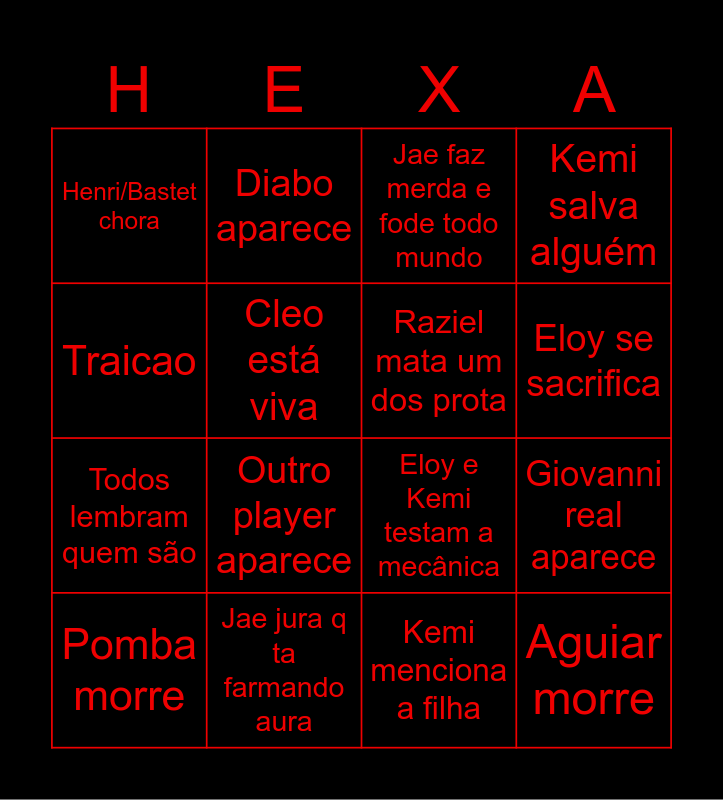 This bingo card has 16 words: Jae jura q ta farmando aura, Giovanni real aparece, Jae faz merda e fode todo mundo, Henri/Bastet chora, Todos lembram quem são, Diabo aparece, Eloy e Kemi testam a mecânica, Kemi menciona a filha, Traicao, Cleo está viva, Pomba morre, Kemi salva alguém, Outro player aparece, Eloy se sacrifica, Raziel mata um dos prota and Aguiar morre.