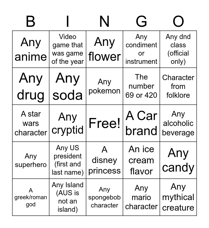 This bingo card has a free space and 24 words: Any US president (first and last name), Any Island (AUS is not an island), Any pokemon, A greek/roman god, Any dnd class (official only), Any anime, Any drug, Video game that was game of the year, A Car brand, A disney princess, The number 69 or 420, A star wars character, An ice cream flavor, Any candy, Any soda, Any mario character, Any alcoholic beverage, Any flower, Character from folklore, Any cryptid, Any mythical creature, Any superhero, Any condiment or instrument and Any spongebob character.
