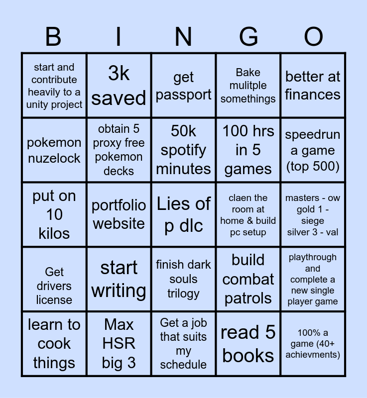 This bingo card has a free space and 24 words: start writing, Max HSR big 3, 50k spotify minutes, learn to cook things, better at finances, start and contribute heavily to a unity project, pokemon nuzelock, 3k saved, claen the room at home & build pc setup, finish dark souls trilogy, 100 hrs in 5 games, put on 10 kilos, build combat patrols, playthrough and complete a new single player game, obtain 5 proxy free pokemon decks, read 5 books, masters - ow gold 1 - siege silver 3 - val, get passport, speedrun a game (top 500), portfolio website, 100% a game (40+ achievments), Get drivers license, Bake mulitple somethings and Get a job that suits my schedule.