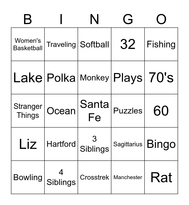 This bingo card has 25 words: Hartford, Crosstrek, Monkey, Bowling, Fishing, Women's Basketball, Lake, Traveling, Puzzles, 3 Siblings, Plays, Stranger Things, Sagittarius, Bingo, Polka, Rat, 60, Softball, 70's, Ocean, Santa Fe, 4 Siblings, Liz, 32 and Manchester.