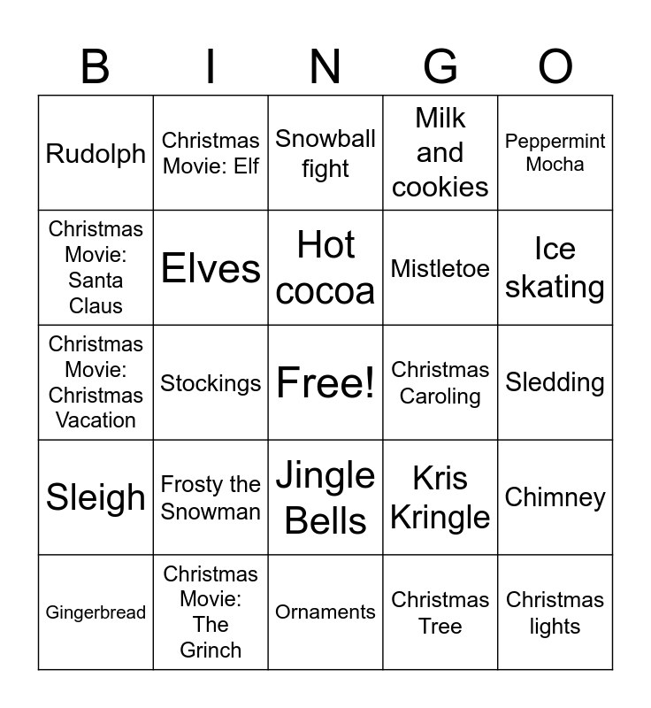 This bingo card has a free space and 24 words: Gingerbread, Frosty the Snowman, Hot cocoa, Christmas Tree, Peppermint Mocha, Rudolph, Christmas Movie: Elf, Snowball fight, Christmas Caroling, Sledding, Christmas Movie: Christmas Vacation, Elves, Kris Kringle, Chimney, Christmas Movie: Santa Claus, Christmas Movie: The Grinch, Ornaments, Milk and cookies, Ice skating, Sleigh, Stockings, Jingle Bells, Mistletoe and Christmas lights.