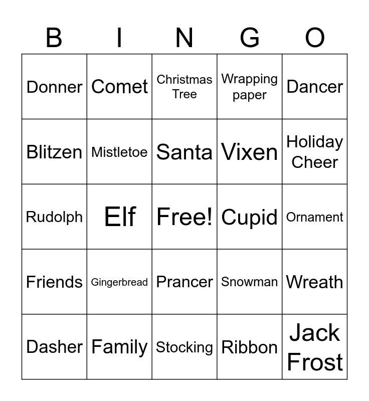 This bingo card has a free space and 25 words: Gingerbread, Stocking, Santa, Dasher, Dancer, Donner, Blitzen, Comet, Cupid, Prancer, Vixen, Rudolph, Snowman, Wreath, Mistletoe, Gift, Ornament, Christmas Tree, Holiday Cheer, Elf, Jack Frost, Family, Friends, Wrapping paper and Ribbon.