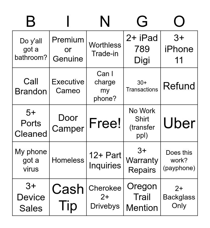 This bingo card has a free space and 24 words: Homeless, Cash Tip, Can I charge my phone?, 3+ Device Sales, 3+ iPhone 11, Do y'all got a bathroom?, Call Brandon, Premium or Genuine, No Work Shirt (transfer ppl), 12+ Part Inquiries, 30+ Transactions, 5+ Ports Cleaned, 3+ Warranty Repairs, Does this work?(payphone), Executive Cameo, Oregon Trail Mention, Uber, Worthless Trade-in, Refund, Door Camper, 2+ Backglass Only, My phone got a virus, 2+ iPad 789 Digi and Cherokee 2+ Drivebys.