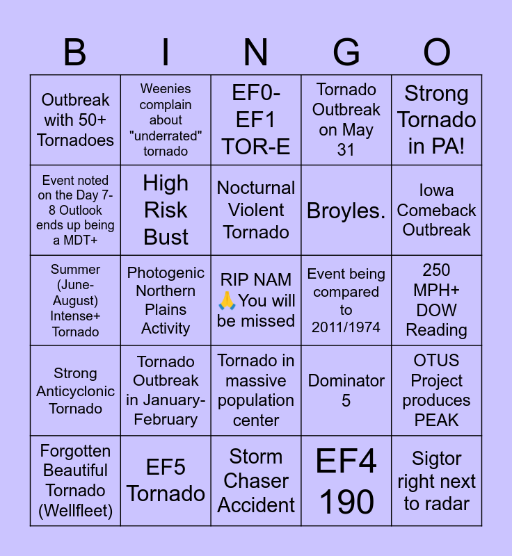 This bingo card has a free space and 24 words: Tornado Outbreak in January-February, EF5 Tornado, Nocturnal Violent Tornado, Forgotten Beautiful Tornado (Wellfleet), Strong Tornado in PA!, Outbreak with 50+ Tornadoes, Event noted on the Day 7-8 Outlook ends up being a MDT+, Weenies complain about "underrated" tornado, Event being compared to 2011/1974, Tornado in massive population center, Broyles., Summer (June-August) Intense+ Tornado, Dominator 5, OTUS Project produces PEAK, High Risk Bust, EF4 190, 250 MPH+ DOW Reading, EF0-EF1 TOR-E, Iowa Comeback Outbreak, Photogenic Northern Plains Activity, Sigtor right next to radar, Strong Anticyclonic Tornado, Tornado Outbreak on May 31 and Storm Chaser Accident.