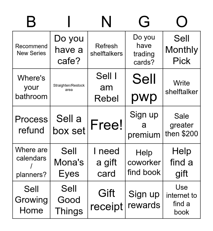 This bingo card has a free space and 24 words: Sell Mona's Eyes, Sell Good Things, Sell I am Rebel, Sell Growing Home, Sell Monthly Pick, Recommend New Series, Where's your bathroom, Do you have a cafe?, Sign up a premium, I need a gift card, Sell pwp, Process refund, Help coworker find book, Help find a gift, Straighten/Restock area, Sign up rewards, Sale greater then $200, Refresh shelftalkers, Write shelftalker, Sell a box set, Use internet to find a book, Where are calendars / planners?, Do you have trading cards? and Gift receipt.