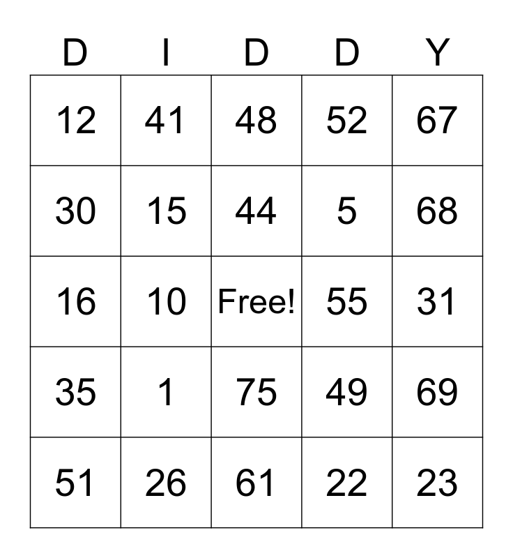This bingo card has a free space and 24 words: 1, 26, 44, 51, 67, 12, 30, 41, 55, 75, 5, 16, 49, 69, 15, 22, 31, 48, 68, 10, 23, 35, 52 and 61.