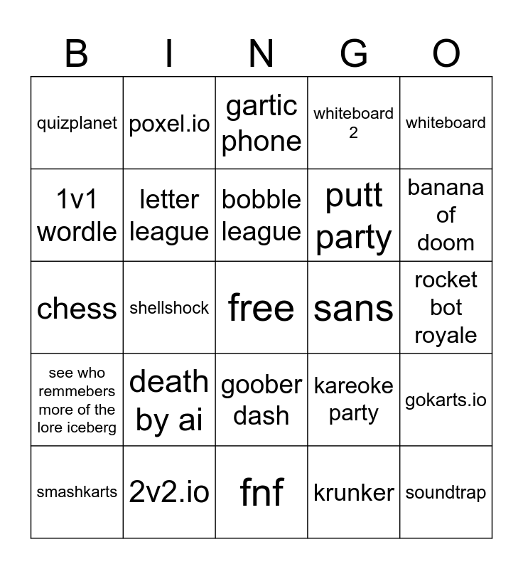 This bingo card has a free space and 24 words: death by ai, 2v2.io, bobble league, smashkarts, whiteboard, quizplanet, 1v1 wordle, poxel.io, sans, goober dash, putt party, chess, kareoke party, gokarts.io, letter league, krunker, rocket bot royale, gartic phone, banana of doom, shellshock, soundtrap, see who remmebers more of the lore iceberg, whiteboard 2 and fnf.