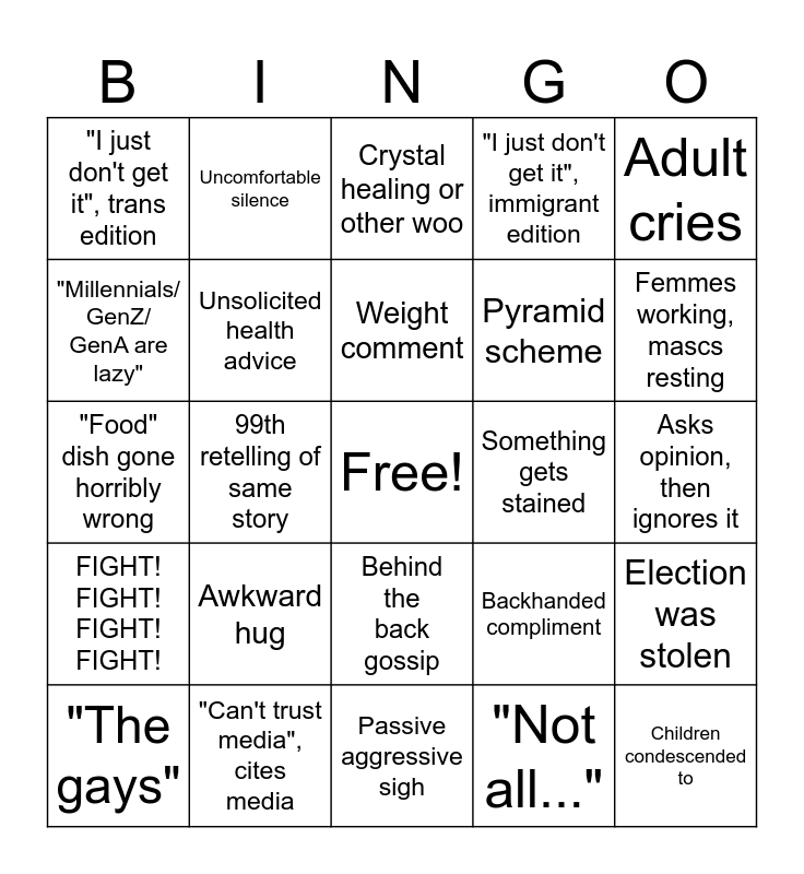 This bingo card has a free space and 24 words: "The gays", Awkward hug, Weight comment, "Not all...", Adult cries, "I just don't get it", trans edition, Uncomfortable silence, Crystal healing or other woo, Something gets stained, Asks opinion, then ignores it, "Food" dish gone horribly wrong, Unsolicited health advice, Backhanded compliment, Election was stolen, "Millennials/ GenZ/ GenA are lazy", "Can't trust media", cites media, Passive aggressive sigh, "I just don't get it", immigrant edition, Femmes working, mascs resting, FIGHT! FIGHT! FIGHT! FIGHT!, 99th retelling of same story, Behind the back gossip, Pyramid scheme and Children condescended to.