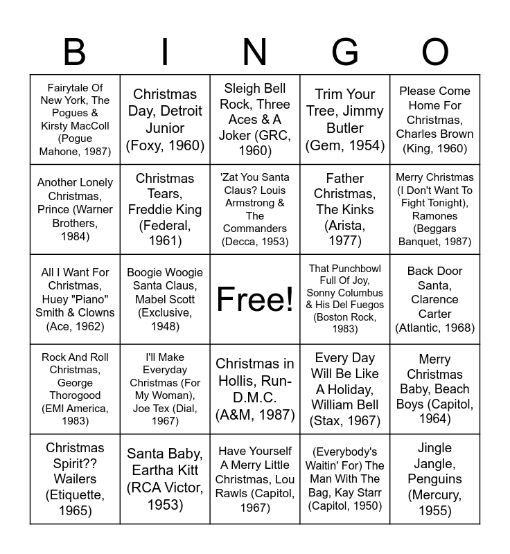 This bingo card has a free space and 100 words: Christmas (Baby Please Come Home), Darlene Love (Philles, 1963), White Christmas, The Drifters (Atlantic, 1954), Back Door Santa, Clarence Carter (Atlantic, 1968), Run Rudolph Run, Chuck Berry (Chess, 1958), Santa Claus Is Back In Town, Elvis Presley (RCA, 1957), Rudolph The Red Nosed Reindeer, Temptations (Motown, 1968), Happy Xmas (War Is Over), John Lennon & Yoko Ono (Apple, 1971), Merry Christmas Baby, Charles Brown (Aladdin, 1956), Santa Claus Is Coming To Town, Jackson 5 (Motown, 1970), Rockin' Around The Christmas Tree, Brenda Lee (Decca, 1958), Jingle Bell Rock, Bobby Helms (Decca, 1957), Rudolph The Red-Nosed Reindeer, The Ventures (Dolton, 1965), (It's Gonna Be A) Lonely Christmas, The Orioles (Jubilee, 1948), Santa Baby, Eartha Kitt (RCA Victor, 1953), Christmas Time's A-Coming, Mac Wiseman (King, circa 1979), Christmas Celebration, B.B. King (Kent, 1962), Father Christmas, The Kinks (Arista, 1977), If We Make It Through December, Merle Haggard (Capitol, 1973), Christmas Celebration, Weezer (Geffen, 2000), Step Into Christmas, Elton John (MCA, 1973), Santa's Rap, Treacherous Three (Atlantic, 1984), Feliz Navi-Nada, El Vez (Sympathy For The Record Industry, 1994), Someday At Christmas, Stevie Wonder (Motown, 1966), Merry Christmas Baby, Otis Redding (Atco, 1968), Nothing For Christmas, The Reducers (Rave On, 1988), That Punchbowl Full Of Joy, Sonny Columbus & His Del Fuegos (Boston Rock, 1983), Please Come Home For Christmas, Charles Brown (King, 1960), Every Day Will Be Like A Holiday, William Bell (Stax, 1967), Don't Believe In Christmas, The Sonics (Etiquette, 1965), Who Say There Ain't No Santa Claus, Ron Holden (Donna, 1960), Boogie Woogie Santa Claus, Mabel Scott (Exclusive, 1948), Fairytale Of New York, The Pogues & Kirsty MacColl (Pogue Mahone, 1987), Here Comes Santa Claus, Gene Autry (Columbia, 1947), How I Hate To See Christmas Come Around, Jimmy Witherspoon (Supreme, 1948), (Everybody's Waitin' For) The Man With The Bag, Kay Starr (Capitol, 1950), 'Zat You Santa Claus? Louis Armstrong & The Commanders (Decca, 1953), Merry Christmas Baby, Beach Boys (Capitol, 1964), Christmas Boogie, Davis Sisters (RCA Victor, 1953), This Christmas, Donny Hathaway (Atco, 1970), Santa Claus Is Coming To Town, The Crystals (Philles, 1963), Christmastime Here (Could Never Be Like That), Wednesday Week (Midnight, 1984), Holiday Spirit, The dB's (East Side Digital, 1993), All I Want For Christmas, Huey "Piano" Smith & Clowns (Ace, 1962), Christmas Is My Time Of Year, Christmas Spirit (White Whale, 1968), Merry Christmas (I Don't Want To Fight Tonight), Ramones (Beggars Banquet, 1987), Sleigh Bell Rock, Three Aces & A Joker (GRC, 1960), Christmas Everyday, Miracles (Motown, 1963), Christmas Will Be Just Another Lonely Day, Brenda Lee (Decca, 1964), Santa Claus Go Straight To The Ghetto, James Brown (King, 1968), Have Yourself A Merry Little Christmas, Lou Rawls (Capitol, 1967), Cool Yule, Rebel Pebbles (IRS, 1990), Frosty The Snowman, Ronettes (Philles, 1963), (Rockin') Winter Wonderland, Fabulous Thunderbirds (Austin, 1983), Little Drummer Boy, Joan Jett (Boardwalk, 1981), Presents For Christmas, Solomon Burke (Atlantic, 1966), Santa's Got A GTO, Ramonas (self-released, 1990), Hey Santa Claus, Moonglows (Chance, 1953), 2000 Miles, Pretenders (Sire, 1983), 'Twas The Night Before Christmas, Snoop Dogg with Nate Dogg (Death Row, 1993), Trim Your Tree, Jimmy Butler (Gem, 1954), C-H-R-I-S-T-M-A-S, Yobs (Safari, 1980), Santa & The Satellite (Parts 1 & 2), Buchanan & Goodman (Luniverse, 1957), You're A Mean One Mr. Grinch, Thurl Ravenscroft (Mercury, 1965), Christmas Wrapping, Waitresses (ZE, 1981), Gee Whiz, It's Christmas, Carla Thomas (Atlantic, 1963), I'll Be Your Santa Baby, Rufus Thomas (Stax, 1973), Christmas In Jail, Youngsters (Empire, 1956), Santa Looked A Lot Like Daddy, Buck Owens (Capitol, 1965), If I Get Home On Christmas Day, Elvis Presley (RCA, 1971), Marshmallow World, Los Straitjackets (Upstart, 1996), The Christmas Song (Chestnuts Roasting On An Open Fire), King Curtis (Atco, 1968), I'll Make Everyday Christmas (For My Woman), Joe Tex (Dial, 1967), Who Took The Merry Out Of Christmas, Staple Singers (Stax, 1970), Lonesome Christmas, Lowell Fulson (Swing Time, 1950), All I Want For Christmas (Is My Two Front Teeth), Spike Jones (RCA Victor, 1948), Nuttin' For Christmas, Joe Ward (King, 1955), It's Christmas, Marvin & Johnny (Aladdin, 1958), Another Lonely Christmas, Prince (Warner Brothers, 1984), Christmas Spirits, Julia Lee & Her Boy Friends (Capitol, 1948), What Are You Doing New Year's Eve? Orioles (Jubilee, 1949), I Saw Mommy Kissing Santa Claus, John Mellencamp (A&M, 1987), Jingle Jangle, Penguins (Mercury, 1955), Christmas Is The Time To Say I Love You, Billy Squier (Capitol, 1981), Christmas in Hollis, Run-D.M.C. (A&M, 1987), Santa Claus Is Coming, Hank Ballard & The Midnighters (King, 1963), Christmas Day, Detroit Junior (Foxy, 1960), Santa Claus Is Coming To My House, Karla DeVito, (Epic, 1982), Dear Santa (Bring Me A Man This Christmas), Weather Girls (Columbia, 1983), Light of the Stable, Emmylou Harris (Reprise, 1979), Rock And Roll Christmas, George Thorogood (EMI America, 1983), Christmas Time, Chris Stamey Group with the dB's and Syd Straw (Coyote, 1985), Christmas In The Congo, Marquees (Warner Brothers, 1959), Twistin' Bells, Santo & Johnny (Canadian American, 1960), Christmas Spirit?? Wailers (Etiquette, 1965), Christmas Tears, Freddie King (Federal, 1961), Santa Claus Wants Some Lovin', Albert King (Stax, 1974), Christmas (Comes But Once a Year), Amos Milburn (King, 1960), Santa & The Sidewalk Surfer, Crossfires (none, 1963), Reindeer Boogie, Hank Snow, (RCA Victor, 1953) and Away In A Manger, Plankeye (BEC, 1998).