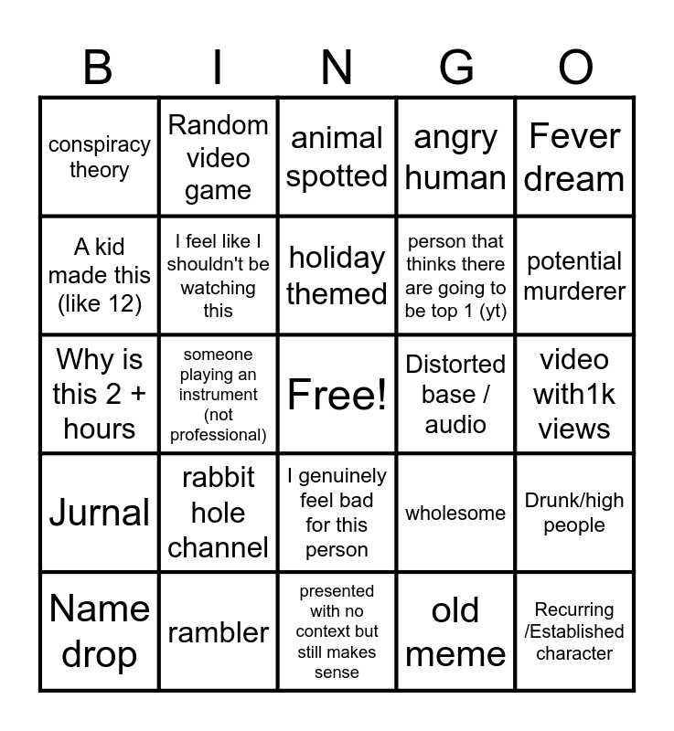 This bingo card has a free space and 34 words: Random NSFW, old meme, random food, school assignment, Jurnal, I feel like I shouldn't be watching this, Fever dream, Name drop, Random video game, foreign language (to me), holiday themed, animal spotted, 1k + subs, 5k or more uplouds, Distorted base / audio, potential murderer, rambler, Why is this 2 + hours, rabbit hole channel, wholesome, I genuinely feel bad for this person, liminal space, conspiracy theory, video with1k views, presented with no context but still makes sense, Recurring /Established character, angry human, happy human, person that thinks there are going to be top 1 (yt), A kid made this (like 12), Is this even legal, someone playing an instrument (not professional), Drunk/high people and bad sport game recording.