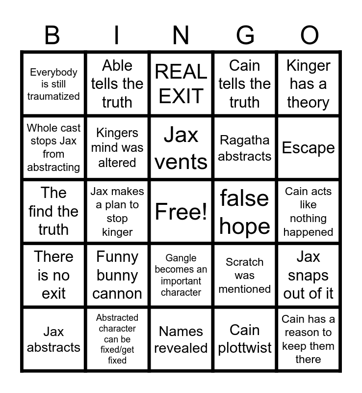 This bingo card has a free space and 24 words: Jax abstracts, Funny bunny cannon, Jax vents, Cain plottwist, Kinger has a theory, Everybody is still traumatized, Able tells the truth, REAL EXIT, false hope, Cain acts like nothing happened, The find the truth, Kingers mind was altered, Scratch was mentioned, Jax snaps out of it, Whole cast stops Jax from abstracting, Abstracted character can be fixed/get fixed, Names revealed, Cain tells the truth, Escape, There is no exit, Jax makes a plan to stop kinger, Gangle becomes an important character, Ragatha abstracts and Cain has a reason to keep them there.