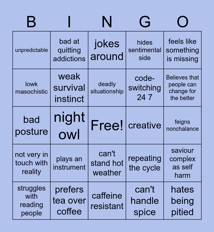 This bingo card has a free space and 24 words: plays an instrument, prefers tea over coffee, deadly situationship, struggles with reading people, feels like something is missing, unpredictable, lowk masochistic, bad at quitting addictions, creative, can't stand hot weather, code-switching 24 7, bad posture, repeating the cycle, saviour complex as self harm, weak survival instinct, can't handle spice, feigns nonchalance, jokes around, Believes that people can change for the better, night owl, hates being pitied, not very in touch with reality, hides sentimental side and caffeine resistant.
