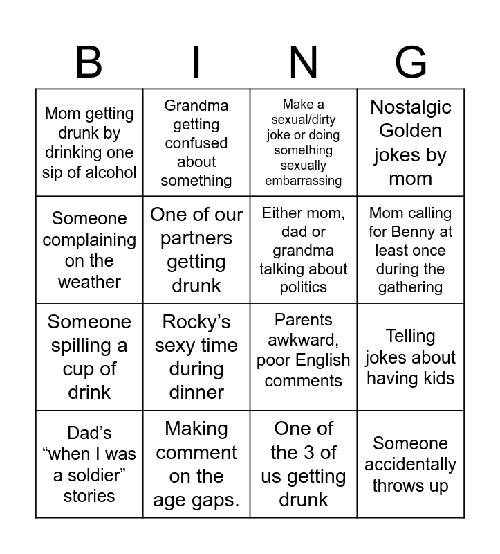 This bingo card has 16 words: Making comment on the age gaps., Telling jokes about having kids, Make a sexual/dirty joke or doing something sexually embarrassing, Mom getting drunk by drinking one sip of alcohol, Someone spilling a cup of drink, Grandma getting confused about something, Parents awkward, poor English comments, One of the 3 of us getting drunk, Someone complaining on the weather, One of our partners getting drunk, Dad’s “when I was a soldier” stories, Nostalgic Golden jokes by mom, Rocky’s sexy time during dinner, Mom calling for Benny at least once during the gathering, Either mom, dad or grandma talking about politics and Someone accidentally throws up.