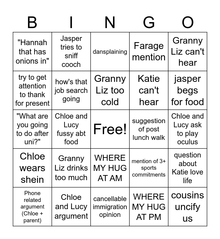 This bingo card has a free space and 24 words: Granny Liz drinks too much, Chloe and Lucy argument, Granny Liz too cold, Phone related argument (Chloe + parent), Granny Liz can't hear, "Hannah that has onions in", try to get attention to thank for present, Jasper tries to sniff cooch, suggestion of post lunch walk, WHERE MY HUG AT AM, Katie can't hear, "What are you going to do after uni?", mention of 3+ sports commitments, question about Katie love life, how's that job search going, WHERE MY HUG AT PM, Chloe and Lucy ask to play oculus, dansplaining, jasper begs for food, Chloe and Lucy fussy abt food, cousins uncify us, Chloe wears shein, Farage mention and cancellable immigration opinion.
