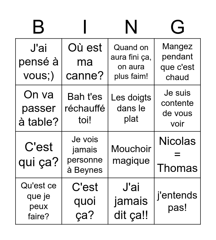 This bingo card has 16 words: C'est quoi ça?, Nicolas = Thomas, Quand on aura fini ça, on aura plus faim!, J'ai pensé à vous;), C'est qui ça?, Où est ma canne?, Mouchoir magique, J'ai jamais dit ça!!, On va passer à table?, Bah t'es réchauffé toi!, Qu'est ce que je peux faire?, Mangez pendant que c'est chaud, Je vois jamais personne à Beynes, Je suis contente de vous voir, Les doigts dans le plat and j'entends pas!.