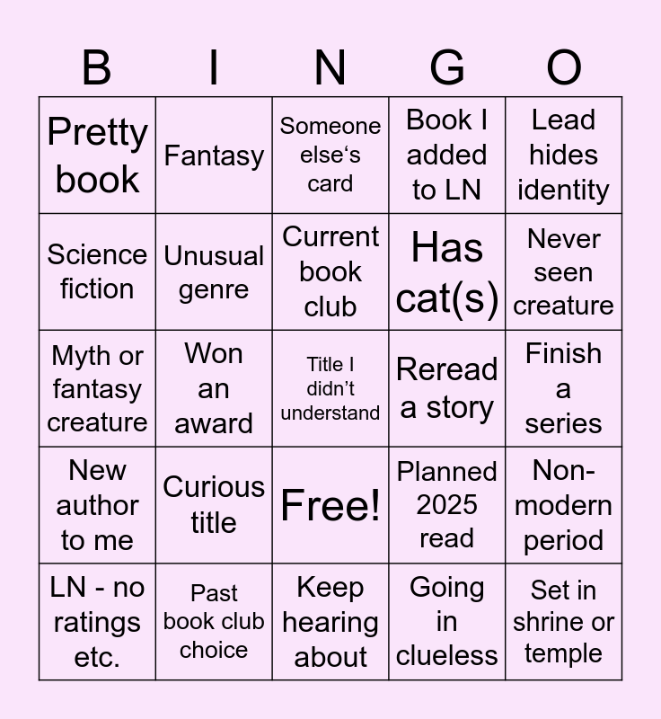 This bingo card has 26 words: Free!, Going in clueless, Current book club, Past book club choice, Lead hides identity, Pretty book, Science fiction, Fantasy, Finish a series, Planned 2025 read, Has cat(s), Myth or fantasy creature, Non-modern period, LN - no ratings etc., Won an award, Has ghost(s), Book I added to LN, New author to me, Someone else‘s card, Title I didn’t understand, Never seen creature, Keep hearing about, Reread a story, Curious title, Unusual genre and Set in shrine or temple.